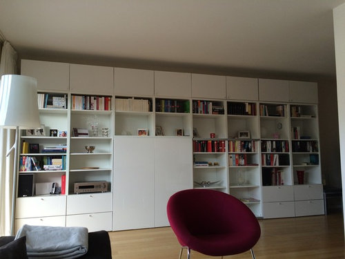 Kommentare (50)Unbedingt! Beim Teppich und den Sofas sollte man so weit es geht auch auf Symmetrie achten. Wenn man zudem die Sofas nur 5 cm weiter von der Wand weg rückt, kostet das nicht viel Platz, läßt aber den Raum sofort größer wirken. Das ist zwar ein uralter, aber dennoch sehr effektiver Trick. Ich würde noch die Beine des Tisches kürzen, er wirkt etwas zu hoch. Weiß lackiert könnte er auch besser zum Regal passen. Ein oder zwei Steh-/Leseleuchten (einheitlich und passend zur Tischleuchte beim TV) würden alles noch abrunden. Auf die Deckenleuchte würde ich verzichten....mehr- vor 10 Jahren