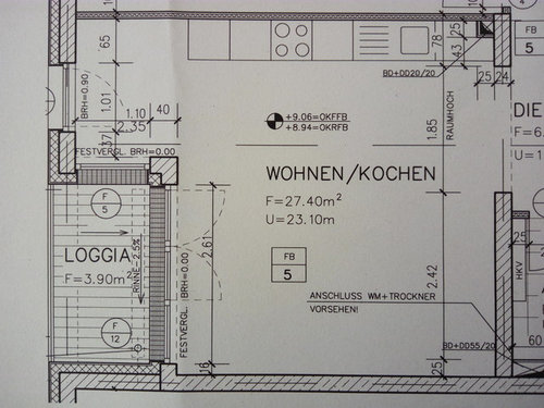 Die Küche ist bereits fest geplant und erstreckt sich (anders als auf dem Grundriss) über die komplette lange Wand, also bis zum Fenster.