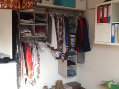 Kommentare (11)Die Nähmaschine gehört unters Fenster, finde ich, der Raum ist ja sowieso so dunkel. Natürliches Licht bringt enorme Erleichterung für die Augen, besonders bei dunklen Stoffen. Ich glaube, ich würde da ein Nähmöbel oder einen Schreibtisch hinstellen, auf den die Nähmaschine kommt. Alle Utensilien kann man dann in dessen Schubladen unterbringen. Zum Bügeln würde ich so ein kleines Brett bunt beziehen. Das kannst Du dann auf den Schreibtisch legen, die Naht ausbügeln und wieder weglegen und weiternähen. Viel praktischer als ein normales Bügelbrett, handlicher, nimmt nicht so viel Platz weg. Für Pinsel, Stoffe etc - falls Du sie nicht dekorativ unterbringen willst, a la Pattydoo, könntest Du vielleicht ein Regal machen, vor das Du einen selbstgenähten tollen Vorhang hängst. Das schmückt und ist praktisch und billig zugleich. Aber wie anordnen? Mir scheint das Zimmer für alle diese Zwecke zusammen winzig... Vielleicht das Bett rechts an die Wand? Zeichne doch mal alles maßstabsgetreu auf Papier, auch Möbel dazu, und die schneidest Du dann aus und schiebst sie auf Deinem Papiergrundriss hin und her, bis es Dir schön scheint? Ich hätte auch gern so ein Zimmer. Die Enge ist herausfordernd, aber die Möglichkeiten sind begeisternd....mehrBrauche Hilfe für neues Schlafzimmer