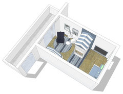 Kommentare (14)Liebe Carina, ich bin keine Pro, habe aber eine Grundriss-Idee für Euer (schiefes:) Zimmer, siehe meine Skizze. Hinter die Eingangstür würde ich 100cm Schrank stellen (zB. Pax von Ikea, 35cm tief), da fällt er wenig auf und Ihr habt viel Stauraum. Zum Bsp 50 cm Regalboden-Schrank für Eure Aktenordner und 50 cm Ausziehkleiderstangen-Schrank für Eure Gäste. Daran anschließend kann ein Schrankbett stehen (dieses hier nur als Beispiel der Maße wegen, es hat auch die gleiche Höhe wie die Pax Schränke: Schrankbett 140 Liegefläche), das je nach Qualität eine gute Schlafmöglichkeit für Gäste bietet, aber im Alltag nicht stört / "rumsteht". Es gibt auch Schrankbetten, die mit Regalen aufgelockert sind, um eine "Schrank-Wand-Atmosphäre" zu vermeiden. Am Ende dieser Seite würde ich eine (selbst/ von SchreinerIn gebaute) Schreibtischplatte ansetzen, die über Eck geht und die gesamte Wandfläche der kurzen Wand abdeckt. Dabei wärt Ihr flexibel, was Eure gewünschte Schreibtisch-Tiefe betrifft und Ihr könntet auch Schubladen-Container als "Füße" verwenden etc. Zwar guckt Ihr dann während des Arbeitens die Wand an, aber die könnt Ihr ja zum Einen mit Bildern o.ä. verschönern und zum Anderen... ....könntet Ihr in der anderen Zimmerecke einen gemütlichen Sessel so flexibel hin schieben, dass Ihr durchs Fenster rausgucken und chillen könnt. Praktisch an dem ganzen finde ich, dass Ihr nichts umbauen/ zur Seite räumen müsst, wenn Gäste kommen. Schrankbett runterklappen und fertig! Beste Grüße und viel Erfolg beim Ideen-Sammeln und -Umsetzen, Jennifer...mehrBrauche Hilfe bei der Planung vom Anbau
