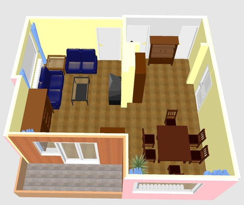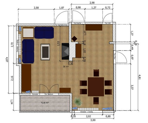 Ich suche nun nach einem neuen Konzept für das gesamte Zimmer. Dabei ist prinzipiell alles veränderbar, bis auf die oben genannten zum Haus gehörenden Bestandteile. Das einzige Möbelstück, welches auf jeden Fall erhalten bleiben soll, ist die Vitrine, welche zwischen Küchentür und Gäste-WC Tür steht.