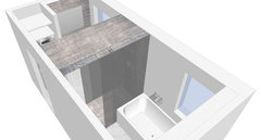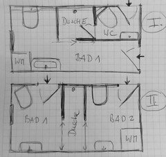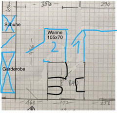 Kommentare (13)Hallo IFI, dasHaus ist aus 1963. das Bad nutzen 3 Personen, 2 davon Teens. Unser Verwandter ist Handwerker, aber leider hat er keine Ideen. Die Anschlüsse wollten wir möglichst nicht verlegen. Bisher hatten wir Wanne,, WB+!UnterschrankI, StandWC. Da über dem Badfenster ein großer Balkon ist,ist es auch recht dunkel im Bad. Ich hab ein paar Ideen: Im baugleichen Bad eine Etage höher haben wir quer vors Fenster große Duschwanne und eine Glaswand. Das Geputzte funktioniert mit den Kindern nicht und mir ist im Winter vorm Fenster kalt beim Duschen. Meine Idee wäre ein neues, schmäleres aber höheres Fenster, sodass eine größere Ecke entsteht. Darein eine 5-Eck Duschtasse, oder falls möglich (Muss man nach Entfernung der Wanne sehen) bodengleiche Dusche. beidseits schmale gemauerte Wände bis ca. 1,20m, obendrauf Glasscheiben. An der Längswand an die Duschwand anschließend ebenfalls gemauert und gefliest eine Ablage mit einem Aufsatzwaschbecken. Darüber ein Wandwasserhahn. Dafür müsste man einen Vorsprung machen, denke ich, für die Anschlüsse? Das nächste Problem ist die Tür. Zur Zeit misst sie 54 cm und hat Sägelöcher wg ehemaligem Gas im Bad. Außerdem geht sie nach außen auf und kommt damit einer anderen ins Gehege. Wir brauchen also ne neue. Geht da eine Schiebetür? Wie? Wenn es akustisch einigermaßen dicht sein soll? Auf der "Toilettenseite" muss auch ein Vorbau auf Höhe 1,40m, da dort neue Wasserrohre laufen, die man nicht in die Wand legen kann, da diese zu schmal ist. Dort könnte dann auch der Spülkasten rein. Obendrüber die Heizung. Ach ja und natürlich Decke abhängen, superflachem Deckeneinbauleuchten, eine davon über der Dusche. was halten Sie...mehrBadplanung: Wer hat einen besseren Vorschlag zur Aufteilung?