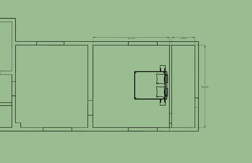 Im aktuellen Zustand ist das Schlafzimmer zu groß - ich mag es nicht, wenn man um das Bett herum viel Platz hat und das Schlafzimmer mit Schränken vollzustellen möchte ich auch nicht. Da die Fassade komplett neu gemacht wird, bin ich bei der Positionierung von Fenstern, sowie bei ihrer Größe sehr flexibel. Die Wand zwischen dem Schlafzimmer und der Bibliothek ist 34 cm dick und tragend. Das Koordinatensystem der Skizze entspricht in etwa den Himmelsrichtungen, nach Osten und Süden gibt es eine unverbaubare Fernsicht. Mir persönlich gefällt diese Variante: