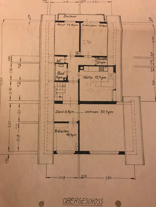 Kommentare (13)@ankestueber: Ja es gab einen Bau des "Grundhauses" und dann 6 Jahre später den Anbau in Form des Rundbaus. Alle Wände, die man hier sehen kann, bis auf die alten und neuen Außenwände sind jedoch nicht tragend und können bis auf den Schornschein, der durchs Bad geht rausgenommenw erden (was wir auch gemacht haben). Unsere idee war im mittleren Stockwerk, dass wir das Bad Richtung Küche und Richtung Flur zu Vergrößern. Die Wand die die Essnische und die alte Küche getrennt hat ist schon herausgenommen. Hier wären die Grundrisse dazu wie wir es uns gedacht hätten (Toilette beim reinkommen sehen finde ich auch nicht schön, genauso wenig beim baden, daher wurde eine Mauer eingeplant): Blick beim reinkommen (Bitte die Fliesenfarben außenvor lassen): Küche (auf der rechten Seite sieht man die Wand die dann weiter rein rückt): Offene Küche finde ich auch ganz nett, aber wir hatten das daheim und ich fande dieser Bratgeruch lag dann immer und überall, vor allem im Winter, in der Luft, daher möchte ich das gerne durch eine Glastüre trennen (Durchgang ist 1,20 m breit; links zu sehen). In die oben in meiner bearbeiteten Zeichnung benannte Essnische wollen wir einen größeren Durchbruch mit Schiebetüre machen, die dann quasi in der Wand verschwinden kann (Unten zu sehen im Küchenplan). Im Keller finde ich es leider etwas zu dunkel (2 Fenster weniger als oben im Rundbau und die sind viel kleiner und vor dem Haus ist Grünzeug) für eine Küche. Der Zugang zum Garten wäre ja dann von der Küche aus durch die Essnische über die Terasse: Ich werde heute Abend nochmal ein paar bessere Grundrisse zeichnen und posten. Wollten nur vorher mal ohne Vorgaben posten in der Hoffnung bessere Vorschläge zu bekommen. Aber eventuell lässt sich das mit unseren Vorstellungen als Grundriss besser umsetzten und sich noch Verbesserungspotential finden :-) Danke schon mal! PS: Heute kommet der Fensterbauer zum ausmessen, wir haben uns für ein Flächenfenster entschieden, da das Fenster genau über der Treppe ist und die Gaupe dann gar nicht mehr "putzbar" gewesen wäre. Wir haben vorher mit Photoshop die Gaupe weggemacht und keiner unserer Freunde und Familie ist es aufgefallen als wir gefragt haben ob ihnen was auffällt. Liebe Grüße...mehrPlanung und Umbau Haus in Goslar