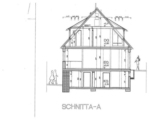 Kommentare (22)Liebe Community, aus dem wirklich enormen Input gefallen mir auf Anhieb folgende Anregungen: 1. Handtuchhalter im Nassbereich statt im Durchgang. Wenn im Nassbereich ein Podest (als Teil der Treppe) gebaut werden sollte, kann man sich da auch super abtrocknen. 2. Stufen anders ausführen (da tendiere ich aber mehr zum haptischen als farblichen Unterschied - entspannend finde ich persönlich eher stark reduzierte Interieurs; Opulenz an Strukturen, Farben und Materialien ist nicht so meins...) 3. ein ungestörter Laufrhythmus ist auf jeden Fall wichtig; wenn drei Stufen besser sind als vier, dann sollte die maximale Füllhöhe und damit die Treppensituation angepasst werden (45 cm statt 60 cm?) 4. Schiebetür, die an der Decke läuft und sich über den Eingang zum Nassbereich schieben lässt, damit der WC/Bidet-Bereich großzügiger geöffnet werden kann - super! Der WC/Bidet-Raum sollte allerdings schon richtig abgetrennt werden können. Deshalb muss die Wand rund ums WC eigentlich auch bis ganz an die Decke gezogen werden. Finde ich auch nicht so schön, andernfalls ist die WC-Separierung aber auch nur so halbgar. Es geht wirklich darum, Geräusche und Gerüche abzuhalten. Ein Washlet würde die Gestaltung enorm vereinfachen. Ich muss zugeben, selbst noch nie eines ausprobiert zu haben, jedoch ziemliche Vorbehalte dagegen zu haben. Wahrscheinlich ist es eine eigene Diskussion wert, ob WC/Bidet oder Washlet vorzuziehen ist. Noch heute habe ich von einem Badspezialisten gehört, dass noch keiner seiner Kunden den Einbau eines Washlets bereut hat. Haben die aber auch schon vorher ein Bidet benutzt, oder wurden sie das erste Mal quasi mit dem Thema konfrontiert? Das konnte er mir nicht sagen. Ich werde mich in den nächsten Tagen mal in eine der Badausstellungen begeben und ein Washlet ausprobieren:-) Das unter der Decke sitzende kleine Fenster wurde ja etwas kritisch "beäugt". Eigentlich ist dies noch kein Fenster, sondern momentan nur eine mit Glasbausteinen gefüllte Wandöffnung, die die über dem Gäste-WC liegende "Spielkammer" mit Tageslicht versorgt. Die Lage habe ich hier noch mal eingezeichnet: Die Glasbausteine sind wie das ganze Haus aus den 70ern, deshalb wollte ich sie nach Entfernung des Betons zwischen Gäste-WC und Spielkammer gegen ein normales Fenster austauschen. Einfach zumauern wäre doch schade, zudem das Fenster schönes Westlicht abbekommt.. Es gibt noch ein weiteres Fenster, das ich der Einfachheit halber bisher gar nicht erwähnt habe. Es befindet sich im Gäste-WC und ist von außen verklinkert, als Sicht- und Einbruchschutz vermute ich, so etwas sieht man in unserer Siedlung öfter. Der Klinker nimmt natürlich jegliches Licht und macht den Raum, das Gäste-WC wahnsinnig ungemütlich. Den Klinker zu entfernen und daraus ein vollwertiges Fenster zu machen, wäre für die Fassade aber - in meinem Empfinden - nicht so vorteilhaft, hier ein Bild: Ich bin gespannt, ob andere es auch so sehen wie ich. Eine Formveränderung zu planen, als Beispiel nach oben hochziehen - das erscheint mir als größerer Eingriff, den ich ohne Architektenbegleitung nicht durchziehen und im Zuge dieser Umbaumaßnahme auch nicht in Angriff nehmen möchte. Zudem handelt es sich um ein Fenster zur Straße, nach Nordosten - das Ganze dann im Bad.. In meinem Empfinden also weg damit. Im Beitrag von Ingenieurbüro für Innenarchitektur - IFI wird der alte Eingang zum Gäste-WC thematisiert. Diesen für eine Ablagenische zu nutzen gefällt mir sehr gut. Wäre es auch denkbar, an dieser Stelle, oberhalb der Wanne, (satiniertes) Glas einzubauen? Als architektonisches Gimmick.. Man würde dann beim Duschen in den Eingangsbereich des Hauses gucken ;-) Falls wir das Bad so realisieren, werde ich natürlich sehr gerne Fotos posten. Allerdings steht das Projekt seit heute unter einem noch größeren Fragezeichen als bisher. Ein Badspezialist hat uns darauf hingewiesen, dass die Größe des Wasserspeichers für die angepeilten Badedimensionen mit 100 l lächerlich klein ist! Zwar sind 100 l für eine vier- vielleicht auch mal fünfköpfige Familie, die gerne und viel duscht auch ohne Superbadewanne wenig. Aber ob man auf 200 l oder wegen der Superwanne auf 300 l oder mehr erweitert ist schon nicht so unerheblich - ein weiterer Punkt auf der ohnehin schon ellenlangen Liste der "Nebenschauplätze". Ich wollte jetzt mal einen Entwurf mit weniger Wasserverbrauch ausarbeiten.. Liebe Grüße Martina...mehrBadezimmer: Trennwand - ja oder nein?