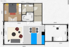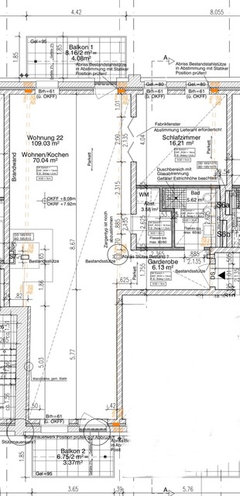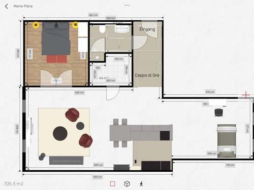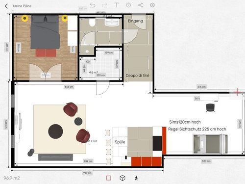 Unser Wohn-/Küchen-/Schlafbereich ist 86 qm groß. Links ist unser Wohnbereich, in der Mitte bei dem Versorgungsschacht (beige) soll die Küche stehen und rechts der Bereich für unseren Sohn, der sich einen Sichtschutz in Form eines Regals wünscht.
