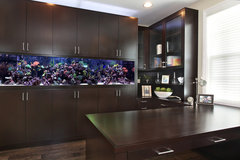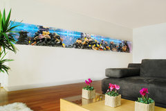 Das bedeutet, leuchtendes Neonlicht, damit die Korallen und Annemonen besser leuchten. Dazu kommt noch ein grosses, schwarzes Eckledersofa und grauer Parkettboden. Ich finde keine Wandfarbe, die das Zimmer wärmer aussehen lässt. Ich brauche eine Farbe die das Neonlicht resorbiert. Es ist einfach nur kalt. Ich bin eher der Landhaustyp und mein Mann eher die entgegengesetzte Richtung. Vielleicht gibt es einen Kompromiss. Was Farbe angeht, bin ich immer sehr mutig. Nur hier stoße ich an meine Grenzen.