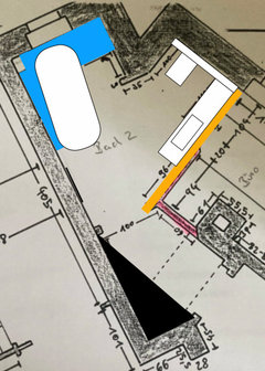 Hier bleibe ich bei meinem Vorschlag. Ich stelle mir hier einfach die Dusche mit Sitzbank am Fenster richtig schön vor. Das macht das Bad dann auch optisch breiter und betont nicht noch die Zuspitzung, die es eng erscheinen lässt. Hier muss man dann sehen, wieviel Platz die Therme einnimmt und wie man das einbindet, dann kann der Waschtisch vielleicht spitz auslaufen.