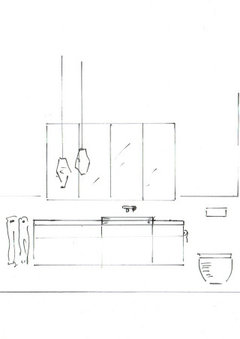 weiche geschwungene Wandformen heben die kleinteiligen Wandstücke auf und lassen den Blick ungehindert drch den Raum schweifen. So wirkt er größer und weiter, und vor allem werden die winkeligen, kleinteiligen Verschachtelungen aufgehoben. An der (neuen) Zentralwand können WC und Waschplatz aufgereiht sein. Der Waschplatz ist hier im Bild 180 x 35 cm groß mit einem normalen 60cm-Becken und einem wandbündigen Spiegelschrank (160 cm).