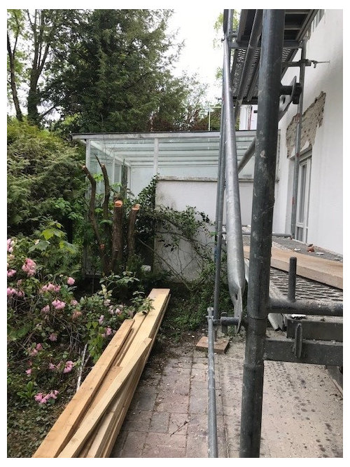 Liebe Houzz Community, ich bräuchte bitte Eure Hilfe. Wir renovieren gerade umfassend. Im Zuge dessen, planen wir einen Anbau im Erdgeschoss, der eine Erweiterung des Wohnraums im EG ist, d.h. wir öffnen die aktuelle Hauswand, bauen in den Garten rein. Zum Garten hin sollen dann zwei Glas-Schiebeelemente für Licht sorgen. Da der Anbau nur im EG ist, planen wir (Velux) Dachfenster auf das (Flach)Dach des Anbaus. Baugenehmigung liegt vor, so weit so gut. Da es sich um eine DH-Hälfte handelt, muss das natürlich ein stimmiges Bild zum Nachbarn sein. Bei den Nachbarn gibt es bereits selbst einen Anbau (Wintergarten), der auf der gemeinsamen Kommunwand aufbaut. Da die Kommunwand bereits „benutzt“ ist, müssen wir eine eigene Mauer (auf unserer Seite) bauen. Nun ist der (legitime) Wunsch der Nachbarin, dass wir ihr möglichst wenig Licht nehmen. Insofern ist eine massive Wand, gegen den Wintergarten der Nachbarin keine ideale Lösung. Wir hatten schon überlegt selbst an unserer Seite mit (Milch)Glas zu arbeiten, und auf der Seite der Nachbarin das Glas zu folieren. Das Ziel ist möglichst viel Ausblick bzw Helligkeit für die Nachbarn zu erhalten. Auf unsere Seite des Anbaus soll übrigens unsere Küche kommen… Für jede Idee wäre ich sehr dankbar. Anbei ein Photo mit der Sicht auf den Wintergarten der Nachbarin