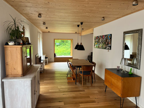 Kommentare (34)Hallo, beim Anschauen eures Grundrisses und dem ursprünglichen Wunsch, etwas Farbe reinzubekommen, sind bei mir folgende Gedanken aufgetaucht: - die Küche hat drei eigenständige Möbelblöcke, die untereinander keine Verbindung haben. - die Küche befindet sich in einem offenen Wohn-Essbereich, es gibt also noch mehr Möbel in dem Raum Ich könnte mir gut vorstellen, die Küchen in eine farbige Klammer zu bringen, d.h. ihr einen Rahmen zu geben, so dass sie als eigenständige "Insel" im Raum wahrgenommen wird. Man könnte auf der Wand, wo die Tür ist und auf der rechten Wand ein zusammenhängendes Farbfeld anbringen bis knapp hinter den Block und nicht bis zur Decke, sondern nur etwas über Türhöhe, so dass die Fenster noch miteingefasst sind, gglfs. auch genau bis zur Tür-/Fensterhöhe. Fensterrollos oder Vorhänge könnten in derselben Farbe sein. Weisse Möbel sehen m.E. vor Farbflächen immer am Schönsten aus. Man könnte eine Farbe von euren Esszimmerstühlen aufgreifen. Evtl. die Farbe etwas verdünnt, heller. Die Küche wird dann als Einheit wahrgenommen und erhält einen Anker im Raum. Nur Mut zur Farbe .. :-)...mehrKücheneinbau und Farbe totale Enttäuschung- Leichtküche Arktisweiß