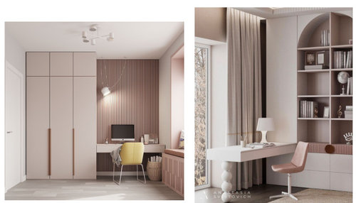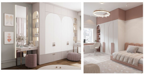 - Links neben dem Fenster möchte ich ein Regal mit integriertem Schreibtisch einbauen. Hier soll Platz für Bücher, Bastelsachen und später auch zum Lernen entstehen. Es wäre super, wenn der Schrank höhenverstellbar ist.