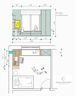 - Was haltet ihr von der Idee mit dem hohen Schrank auf der einen und dem Regal mit Schreibtisch auf der anderen Seite? Gibt es Verbesserungsvorschläge?