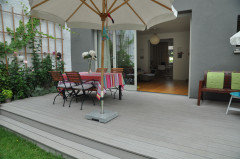 Anbei ein Projekt mit Stufen von der Terrasse zum Garten - zwar ohne Zaun, aber auch mit Rankhilfe mit Wein, Rosen, Lavendel zu einer angrenzenden Wand. Die auf den Bild zu sehenden Dielen sind rutschfest, splitterfrei, pflegeleicht, nachhaltig und in Deutschland hergestellt.