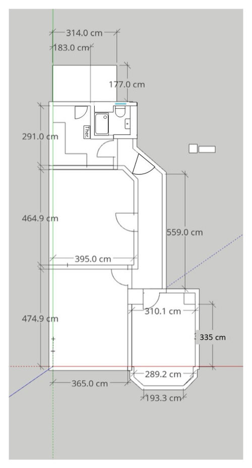 PS.: Die Maße sind nur geschätzt, weil das die Maße sind, die ich bei der ersten Besichtigung der Wohnung vor der Anmietung selber gemessen habe. Damit habe ich versucht, den Grundriss so realitätsnah wie möglich zu zeichnen. Entschuldige für die Anfängerzeichnung, ich bin nur eine Amateurin.
