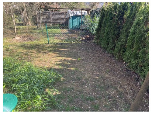 1. Wir haben ein verlorenes Eck hinten links im Garten (siehe Photo), auf Grund der Bäume wächst der Rollrasen überhaupt nicht an. Der Baum davor ist ein Pflaumenbaum (die Früchte sind leider ungenießbar), aber die Früchte fallen auf den Boden, so schnell kommt man gar nicht hinterher sie aufzusammeln. Deshalb hat es viele Bienen dort im Sommer auf dem Boden, weshalb die Kinder diese Ecke auch sehr meiden. Nun sind wir am Überlegen was wir machen.