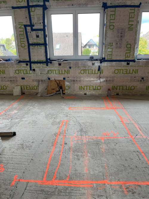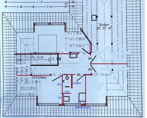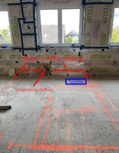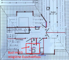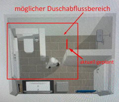 Das Abflussrohr befindet sich unter dem Fenster. Der Abfluss der Dusche soll über das darunter liegende Bad geführt werden, um eine bodenebene Dusche zu bekommen. Daher kann auch der Abfluss nicht unter der Brause. Das darunterliegende Bad geht nur ca. bis dahin. Habt ihr Ideen wie man das besser gestalten kann? Zusätzlich schwanke ich an der Dusche zwischen Trockenbauwand evtl.. mit Nischen um es auf zu lockern oder als feste Glaswand. Über Vorschläge wäre ich dankbar.