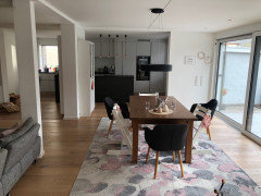 Kommentare (16)Hallo Zusammen, sorry, dass ich mich mit Verspätung melde. - Ich habe seit ein paar Tagen leider Probleme mit Houzz. Entweder öffnen sich Links zu Threads nicht mehr oder es tauchen auf einmal "Platzhalter "für Bilder mitten im Text auf, wie jetzt gerade auch wieder. (Vielleicht sehe aber auch nur ich die - -keine Ahnung!?) Nun gut, zum Thema: Ich sehe es im Grunde sehr ähnlich, wie Anke und würde im bisherigen Wohnzimmer die Funktionsbereiche Essen und Kochen ansiedeln und im Anbau den Wohnbereich. Ich sehe den Vorteil darin, dass mit einer Umwidmung ein zusätzlicher Raum in der ehemaligen Küche entstünde, den man entweder zum Fernsehen, zum Spielen für die Kinder, als Arbeits-od. Gästezimmer nutzen könnte. In jedem Fall aber eine Rückzugsmöglichkeit um die man auch in der harmonischsten Familie manches Mal froh ist, wenn man sie denn hat. Nun bin ich aber so gestrickt, dass ich nicht jeden Besucher in der Küche empfangen möchte. Insofern würde mir eine Lösung mit Küche rechts, Essen links persönlich besser gefallen. Aber das ist vielleicht Geschmackssache. ;-) Um für viel familiär nutzbaren Stauraum zu sorgen würde ich nach einem Küchenprogramm suchen, welches auch Wohnqualitäten hat, oder aber mir etwas vom Tischler auf Maß fertigen lassen (- wohlweißlich sicher auch eine Budgetfrage). Im Bereich der Küche könnte dieses (vorzugsweise helle) Einbaumöbel deckenhoch gestaltet werden und u.a. die von Anke favorisierte Kochnische aufnehmen. Zum Fernseh/Arbeits/´. . . .- Zimmer hin könnte der Schrank entweder als Lowboard auslaufen oder vielleicht sogar eine Nische für ein Bett-Sofa aufnehmen. Der Fernseher könnte an der gegenüberliegenden Wand (des Gäste WCs) angebracht werden. Eine andere Alternative wäre ein integrierter Schreibtisch. Das Gäste-WC würde ich so bemessen, dass neben einem ebenfalls deckenhohen Einbauschrank für die Garderobe ein Durchgang mit Schiebetüre in die ehemalige Küche bliebe. So könnte man etwaigen Besuch entweder da- oder dorthin dirigieren. - Ohne direkt in der Küche zu stehen. Dieser Garderobenschrank könnte sogar noch ein wenig nach rechts hin verbreitert werden und - wie von Anke oben schon einmal vorgeschlagen - auch eine Schiebetür beinhalten, die diesen kleinen Raum zur Küche hin auch noch einmal abtrennen würde. Insofern könnte der Garderobenschrank - um den es ja eigentlich ging ;-)) - auf einer Breite von ca. 150 cm, einer Höhe von ca. 250cm (je nach Deckenhöhe) und einer Tiefe von ca. 65cm gut die Familiengarderobe aufnehmen. So, nun hoffe ich, dass der Upload meines Bildchen geklappt hat und wünsche allseits einen schönen Tag! LG!...mehrHilfe bei Neugestaltung EG - Anordnung der Zimmer