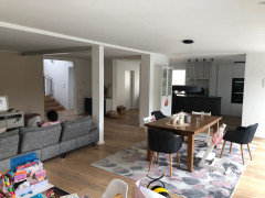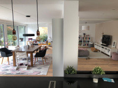 Kommentare (38)Begehbare Glasplatte geht wegen der Höhe nicht. Daher ist die Rigipsplatte schräg. Das Bild ist missverständlich, der rote Pfeil ist die dunkle Holzplatte die man links sieht. Das Stück ist quasi hinter dem Spot, da geht es dann schräg hoch für die Deckenhöhe/Kopffreiheit. Ich habe leider grade kein Bild von der anderen Seite. Das mit dem Glas sieht aber gut aus....mehrNeugestaltung Erdgeschoss im Reihenendhaus - Küche und Wohnzimmer