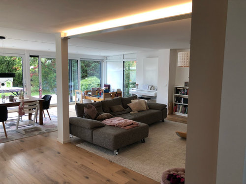 Kommentare (10)Hallo, Ich hatte den gleichen Gedanken mit der Sitzbank an der Fensterseite. Wenn der Tisch, so wie jetzt, nicht an der Wand steht und man sich von zwei Seiten auf der Sitzbank niederlassen kann, finde ich auch einen rechteckigen Tisch passend. Dann würde ich jedoch einen auswählen, bei dem die Tischbeine vom Zentrum ausgehen und nicht an den Ecken sitzen. Das erleichtert das Hinsetzen auf die Bank ungemein 😅 Die Position des Fernsehers würde ich gar nicht verändern. Mit dem Kamin daneben ist die Ausrichtung der sitzmöbel eigentlich auch klar. Was ihr Andenken könntet: die Couch nicht an die wand, sondern schräg in die Ecke stellen. Dadurch öffnet ihr den Blick in den Raum und der Sessel findet seinen Platz in der Nähe des Esstischs. Den Wohnbereich mit einem großen teppich einrahmen, vielleicht noch eine Bogenleuchte hinter der Couch platzieren, fertig 😃...mehr- letzter Monat