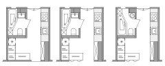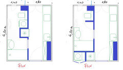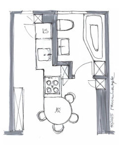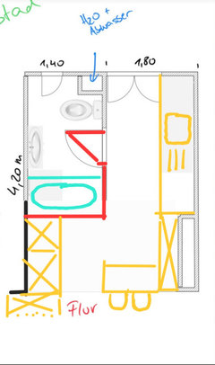 Kommentare (16)Hallo Regine, so langsam formt sich schlüssiges ein Bild, das Wohnung und Bewohner übereinbringt. Danke für Ihre ausführlichen Beschreibungen. Nur mal auf die Schnelle der Ideenansatz, leider auch ohne die Zeit, ihn in eine Handskizze zu übertragen: RAUM Die Tür nach außen öffnend und so weit verschoben, daß sie an der rechten Wand anliegt. Das "Duschportal" ist innen 220 cm hoch und in den Seitenwänden sind integrierte beleuchtete Shampoonischen von 60 x 30 cm (ab 120 cm Höhe) vorgesehen. Entgegen der Skizze befindet sich die Kopfbrause in der Decke. Die Dusche hat ein Gesamtmaß von ca. 100 x 100 cm und wird auf beiden Seiten durch Schwenktüren geschlossen, die sich in die Dusche öffnen. Die 170x75 cm große ovale Wanne liegt schräg im Raum, so daß zur Wand eine Ablage entsteht und der Zugang zum Fenster offen bleibt. Vorn im Raum sind ein 80 cm breiter Waschplatz und ein WC mit ausgesetztem Spülkasten (wie ein Möbel) angeordnet. KONZEPT Leicht, licht, offen. Der große Raum wird in drei Zonen gegliedert, wobei die verschlankte mittlere Zone den Fokus auf sich lenkt. Davor und dahinter sind zwei große, offene Räume, in diene die Sanitärelemente wie kleine Möbel eingestellt sind. Einbaumöbel würden dem Raum Platz wegnehmen und ihn wieder enger erscheinen lassen. MATERIAL Boden und Wannenportal sollten ein einheitliches Material bekommen. Ebenso der Wannensockel der ovalen Wanne und die Ablage hinter der Wanne. Die Wände und Decke könnten einfach gestrichen werden. Ein Spritzschutz ist zwar kaum notwendig, aber wenn gewünscht, könnte die Fläche hinter Waschtisch und WC auch mit einer Fassadenfarbe gestrichen werden. LICHT Licht befindet sich (1) flankierend am Spiegel für den vorderen Bereich und eine gute Ausleuchtung am Spiegel. Als Raumlicht für das innenliegende Bad ist oberhalb des Deckensegels der Dusche eine Lichtquelle (2) , die den Raum indirekt über die Raumdecke aufhellt. So ist der Raum hell, aber keine Lichtquelle dafür zu sehen. Das Licht in den Shampoonischen (3) erhellt das Duschportal. Für ein gemütliches Verweilen im Raum (Wannenbad) stelle ich mir hinten gegenüber der Wanne eine Reihe von Wandeinbauleuchten in Bodennähe (30 cm über dem Boden) vor (4). Ihr Abstand untereinander beträgt rd. 40 cm (4 Stück). An der Tür können das Raumlicht (2) und das Shampoonischenlicht (3) geschaltet werden. Am Spiegel selbst das Spiegellicht (1), und hinter der Dusche im Baderaum das Bodenlicht dort (4). So ist jede Tageszeit und jede Stimmung / Nutzung abgedeckt. PLATZ / STAURAUM Leider ist mir noch keine ideale Idee gekommen, den Platz für Zahnbürste und co. geschickter zu organisieren. Mein erster Gedanke, eine Vorwand mit versenkten Spiegelschrank und ggfls. integriertem UP-Spülkasten ist für diesen Konzeptgedanken in diesem Raum einfach zu mächtig. So bleibt leider nur der Raum auf dem Waschplatz (Seifenschale, Zahnbürste), und natürlich der Stauraum in den Schubladen unterhalb des Waschbeckens, was mir aber für die Nutzung als Zweitbad ausreichend scheint Dusch- und Badezubehör findet in den Nischen und Ablagen ihren Platz und wirken sogar noch dekorativ. TECHNISCHES Die Wanne mit Mittelablauf und Triplexgarnitur wird über den Überlauf befühlt. Dadurch entfällt ein Wanneneinlauf aus der Wand. Die Bedienarmatur dafür ist leicht erreichbar links vor der Wanne. Leicht zu bedienen, hinter der Schwenktür der Dusche. Eine Handbrause ist mit versenktem Schlauch in der hinteren Ablage. Due Brausearmatur der Dusche ist aufgrund der Nische leicht tiefer als gewöhnlich angesetzt. neben ihr die Handbrause ohne Duschstange, optional ein zweiter Brausehalter in Schulterhöhe. ansonsten befindet sich eine Kopfbrause in der Mitte unter der Zwischendecke. In den Vorsatzwänden der Dusche können auch alle Fallrohre und Steigleitungen der oberen Geschosse versteckt werden. Der durchgeflieste Boden enthält einen Bodenablauf mittig des Duschtempels. Die Handtücher werden gegenüber des Waschtisches in einem 600/1700 mm Handtuchheizkörper gehalten. NUTZUNG Das Haupt-Duschbad ist im zweiten Flügel der Wohnung untergebracht, weshalb hier der Schwerpunkt auf Gäste-WC und Wannenbad liegt. Da kaum zu erwarten ist, daß in kurzer Abfolge geduscht und gebadet wird, ist die Dusche entweder in Nutzung, oder trocken, um das Wannenbad zu nutzen. Der Unterschrank am Waschplatz bietet ausreichend Stauraum für die temporäre Nutzung des Bades. So, das nur auf die Schnelle - ich hoffe es hilft weiter :) LG, Steffen Ganzer...mehr♥ Altbaujuwel: Bett & Bad in einem Raum, cleverer Grundriss gesucht!