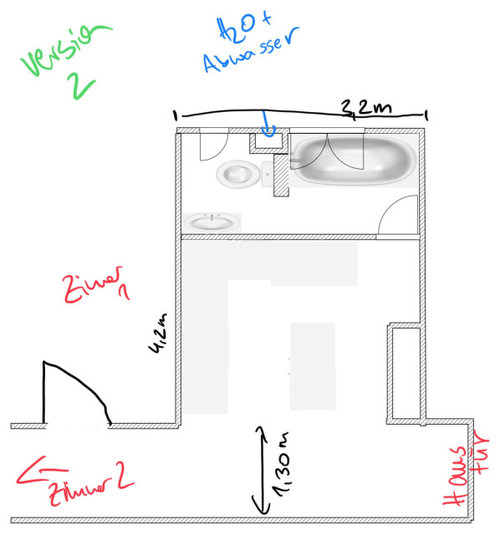 Kommentare (31)Hi, wir haben uns nun für die obige Version entschieden. Aus unserer Sicht lässt sich das Dilemma, gleichzeitig ein Schlafzimmer im hellen Bereich und ein Bad mit einer angemessenen Größe im dunkleren Bereich des Zimmers zu haben am besten so lösen, wie sich aus dem angehängten Grundriss ergibt. Ursprünglich dachten wir, durch das Bad ins Schlafzimmer zu gehen, kann keine gute Lösung sein. Allerdings finden wir den Gedanken jetzt nun richtig gut. Die Idee ist Folgende: - Bad und Schlafzimmer bilden eine Einheit, d.h. einen großen Raum (insbesondere gleicher Boden, gleiches Design) - nichtsdestotrotz lässt sich das Bad auch komplett vom Schlafzimmer trennen - die Toilette mit Waschbecken für "laute" Themen, wie z.B. fönen, ist komplett separiert - auch die sehr geräumige Dusche ist auf dem Weg ins Schlafzimmer nicht sichtbar - ins Bad kommt Tageslicht - das Gefühl wenn man ins Schlafzimmer geht soll so sein, dass man gar nicht wirklich merkt, dass man durch ein Bad durchläuft - durch die Möglichkeit der kompletten Abtrennung der Toilette und der Möglichkeit der Abtrennung des Bades sind wir nicht gezwungen, aktuell schon ein Gästebad einzubauen (die Option soll aber für die Zukunft natürlich bestehen, dewegen würden die Leitungen hinten im Arbeitszimmer erhalten werden - Wir haben damit ca. 10 qm Bad und ca. 17 qm Schlafzimmer - weder im Bad noch im Schlafzimmer haben wir das Problem, "Milimeterarbeit" betreiben zu müssen - die Abtrennung zwischen Bad und Schlafzimmer würden wir mit Glas Schiebeelementen lösen... Was meint Ihr? Sind nun gespannt was die Community sagt :)...mehrGrundrissidee für Sanierung von kleinem Haus