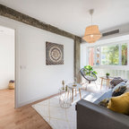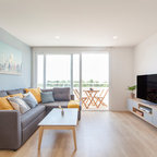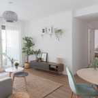Kleines, Offenes Skandinavisches Wohnzimmer mit weißer Wandfarbe, Marmorboden, Kamin, Kaminumrandung aus Stein und grauem Boden in Malaga — Houzz