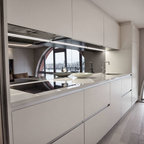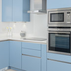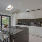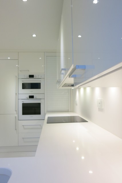 Geschlossene, Kleine Moderne Küche ohne Insel in U-Form mit Unterbauwaschbecken, flächenbündigen Schrankfronten, weißen Schränken, Quarzit-Arbeitsplatte, Küchenrückwand in Weiß, Glasrückwand, weißen Elektrogeräten und Keramikboden in Hampshire —  Houzz
