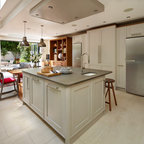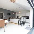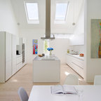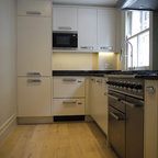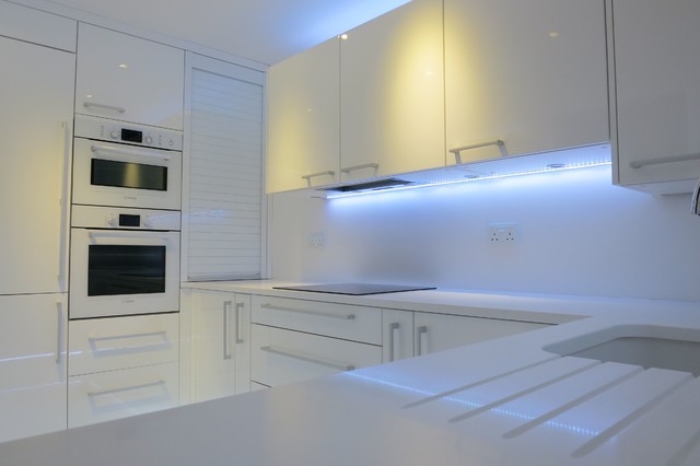 Geschlossene, Kleine Moderne Küche ohne Insel in U-Form mit Unterbauwaschbecken, flächenbündigen Schrankfronten, weißen Schränken, Quarzit-Arbeitsplatte, Küchenrückwand in Weiß, Glasrückwand, weißen Elektrogeräten und Keramikboden in Hampshire — Houzz