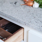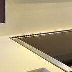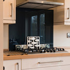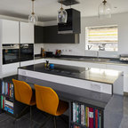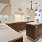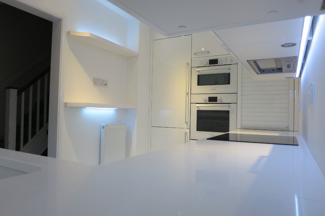 Geschlossene, Kleine Moderne Küche ohne Insel in U-Form mit Unterbauwaschbecken, flächenbündigen Schrankfronten, weißen Schränken, Quarzit-Arbeitsplatte, Küchenrückwand in Weiß, Glasrückwand, weißen Elektrogeräten und Keramikboden in Hampshire — Houzz
