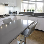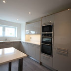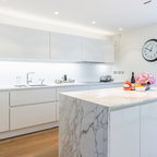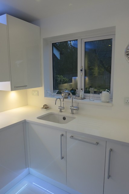 Geschlossene, Kleine Moderne Küche ohne Insel in U-Form mit Unterbauwaschbecken, flächenbündigen Schrankfronten, weißen Schränken, Quarzit-Arbeitsplatte, Küchenrückwand in Weiß, Glasrückwand, weißen Elektrogeräten und Keramikboden in Hampshire — Houzz