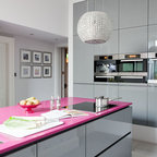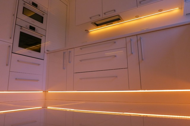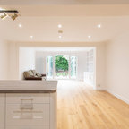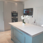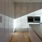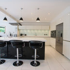 Geschlossene, Kleine Moderne Küche ohne Insel in U-Form mit Unterbauwaschbecken, flächenbündigen Schrankfronten, weißen Schränken, Quarzit-Arbeitsplatte, Küchenrückwand in Weiß, Glasrückwand, weißen Elektrogeräten und Keramikboden in Hampshire —  Houzz