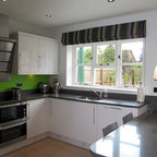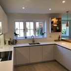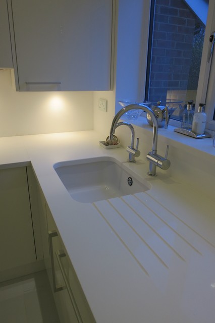 Geschlossene, Kleine Moderne Küche ohne Insel in U-Form mit Unterbauwaschbecken, flächenbündigen Schrankfronten, weißen Schränken, Quarzit-Arbeitsplatte, Küchenrückwand in Weiß, Glasrückwand, weißen Elektrogeräten und Keramikboden in Hampshire — Houzz
