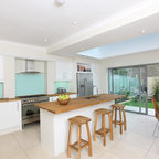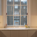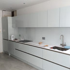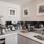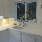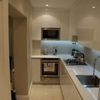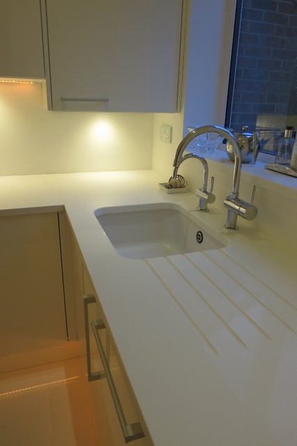 Geschlossene, Kleine Moderne Küche ohne Insel in U-Form mit Unterbauwaschbecken, flächenbündigen Schrankfronten, weißen Schränken, Quarzit-Arbeitsplatte, Küchenrückwand in Weiß, Glasrückwand, weißen Elektrogeräten und Keramikboden in Hampshire — Houzz