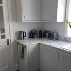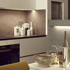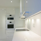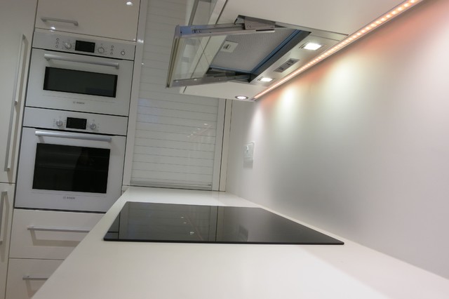 Geschlossene, Kleine Moderne Küche ohne Insel in U-Form mit Unterbauwaschbecken, flächenbündigen Schrankfronten, weißen Schränken, Quarzit-Arbeitsplatte, Küchenrückwand in Weiß, Glasrückwand, weißen Elektrogeräten und Keramikboden in Hampshire —  Houzz