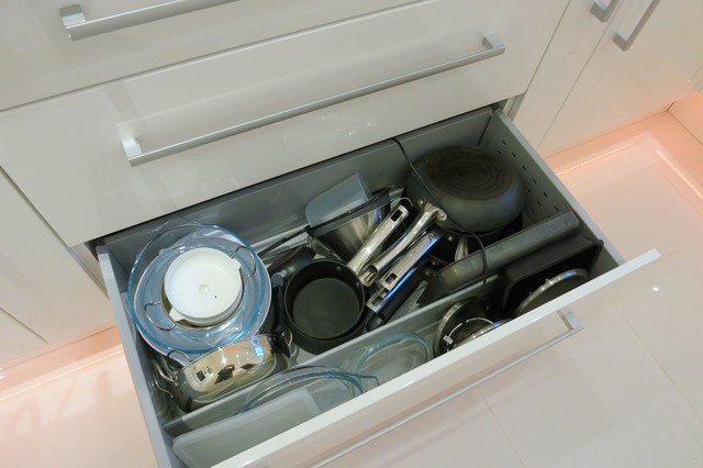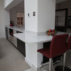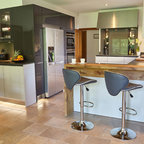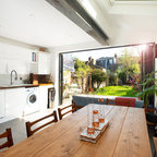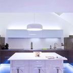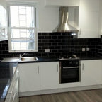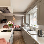 Geschlossene, Kleine Moderne Küche ohne Insel in U-Form mit Unterbauwaschbecken, flächenbündigen Schrankfronten, weißen Schränken, Quarzit-Arbeitsplatte, Küchenrückwand in Weiß, Glasrückwand, weißen Elektrogeräten und Keramikboden in Hampshire — Houzz