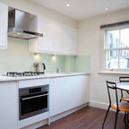 Geschlossene, Kleine Moderne Küche ohne Insel in U-Form mit Unterbauwaschbecken, flächenbündigen Schrankfronten, weißen Schränken, Quarzit-Arbeitsplatte, Küchenrückwand in Weiß, Glasrückwand, weißen Elektrogeräten und Keramikboden in Hampshire —  Houzz