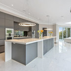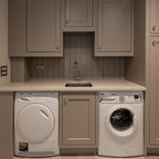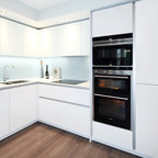 Geschlossene, Kleine Moderne Küche ohne Insel in U-Form mit Unterbauwaschbecken, flächenbündigen Schrankfronten, weißen Schränken, Quarzit-Arbeitsplatte, Küchenrückwand in Weiß, Glasrückwand, weißen Elektrogeräten und Keramikboden in Hampshire — Houzz