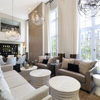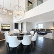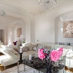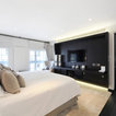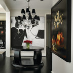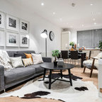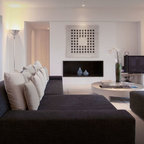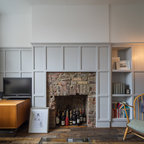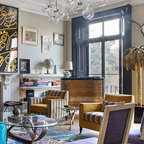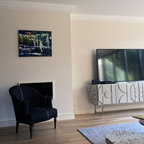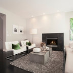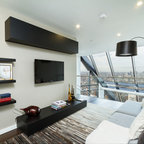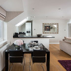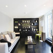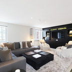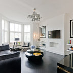 Großes Modernes Wohnzimmer mit weißer Wandfarbe, dunklem Holzboden und schwarzem Boden in London — Houzz
