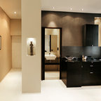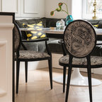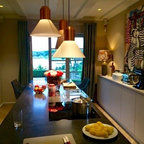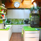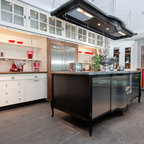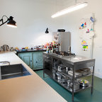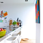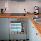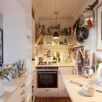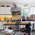 „Er ist mein Lieblingsküchenbauer“, schwärmt von Nordenskjöld, die bereits mehrere Projekte mit dem Tischler und Architekten umgesetzt hat. Der frei stehende Küchenblock ist aus warmgewalztem Edelstahl. In die Arbeitsplatte eingebaut ist ein Herd von Bora mit integriertem Dunstabzug. In der grau lackierten Küchenzeile an der Wand sind die übrigen Küchenutensilien und Kochbücher versteckt. „Manche finden die Küche sicher groß“, sagt von Nordenskjöld. „Doch die beiden bewirten gerne Gäste. Dann relativiert sich die Größe ganz schnell.“