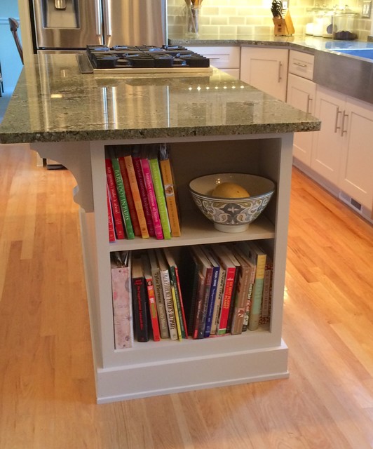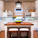 Mittelgroße Landhaus Wohnküche in U-Form mit Landhausspüle, flächenbündigen Schrankfronten, weißen Schränken, Arbeitsplatte aus Holz, bunter Rückwand, Rückwand aus Keramikfliesen, Küchengeräten aus Edelstahl, hellem Holzboden und Kücheninsel in Seattle — Houzz