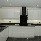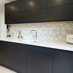 Große, Geschlossene Moderne Küche in U-Form mit Einbauwaschbecken, flächenbündigen Schrankfronten, schwarzen Schränken, Quarzwerkstein-Arbeitsplatte, Küchenrückwand in Grau, Rückwand aus Keramikfliesen, Küchengeräten aus Edelstahl und Keramikboden in London —  Houzz