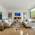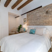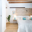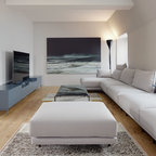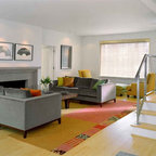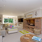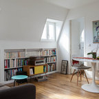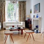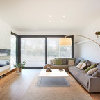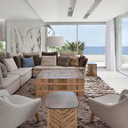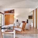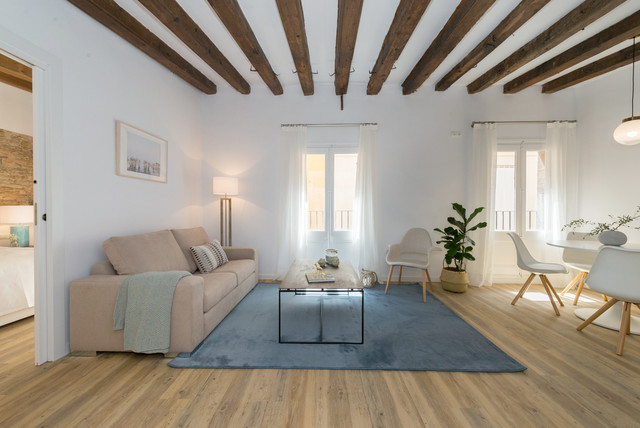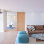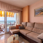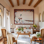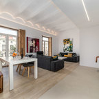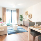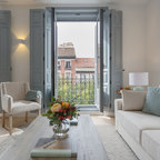 Offenes Mediterranes Wohnzimmer mit weißer Wandfarbe, braunem Holzboden und braunem Boden in Madrid — Houzz