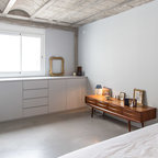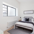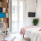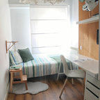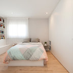Mittelgroßes Skandinavisches Hauptschlafzimmer ohne Kamin mit weißer Wandfarbe und braunem Holzboden in Madrid — Houzz
