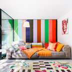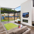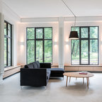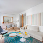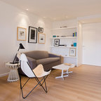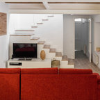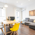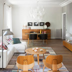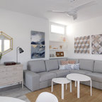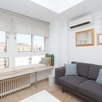 Großes, Abgetrenntes Nordisches Wohnzimmer ohne Kamin mit weißer Wandfarbe, hellem Holzboden und freistehendem TV in Madrid — Houzz