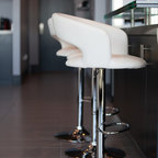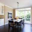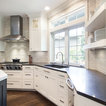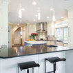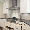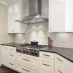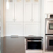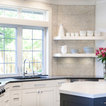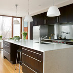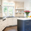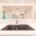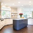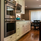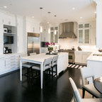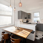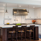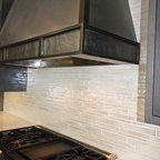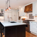 Große Moderne Wohnküche in U-Form mit Unterbauwaschbecken, Schrankfronten im Shaker-Stil, weißen Schränken, Quarzwerkstein-Arbeitsplatte, Küchenrückwand in Beige, Elektrogeräten mit Frontblende, braunem Holzboden, Kücheninsel und Rückwand aus Mosaikfliesen in Portland — Houzz