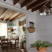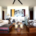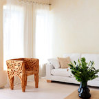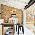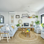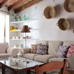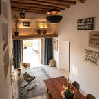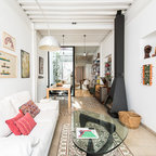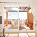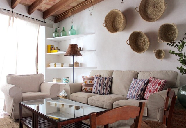 Mediterranes Wohnzimmer mit weißer Wandfarbe und braunem Boden in Madrid — Houzz