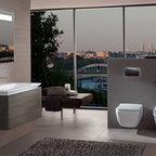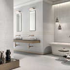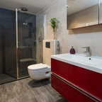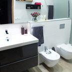 Modernes Badezimmer mit offenen Schränken, weißer Wandfarbe, Aufsatzwaschbecken, Falttür-Duschabtrennung, Duschnische, grauen Fliesen, braunem Holzboden, braunem Boden und grauer Waschtischplatte in Madrid — Houzz