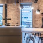 Geschlossene, Zweizeilige, Große Industrial Küche mit Küchenrückwand in Weiß, offenen Schränken, weißen Schränken, Mineralwerkstoff-Arbeitsplatte, Rückwand aus Metrofliesen, Küchengeräten aus Edelstahl und braunem Holzboden in Barcelona — Houzz