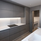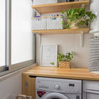 Einzeilige, Mittelgroße Nordische Waschküche mit weißen Schränken und Schrankfronten mit vertiefter Füllung in Barcelona — Houzz